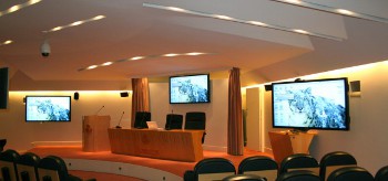 El salón de actos principal se ha mejorado con la instalación de pantallas de alta definición y gran formato de la firma Philips. Estas pantallas cuentan con área visual de 65 pulgadas y están montadas sobre soportes móviles para poder modificar la configuración de la sala y aumentar la visibilidad desde todos los ángulos. Además se ha recolocado una pantalla de 42 pulgadas para facilitar su manejo desde la mesa presidencial y se han instalado conexiones de vídeo HDMI para mejorar la proyección de contenidos desde el portátil.